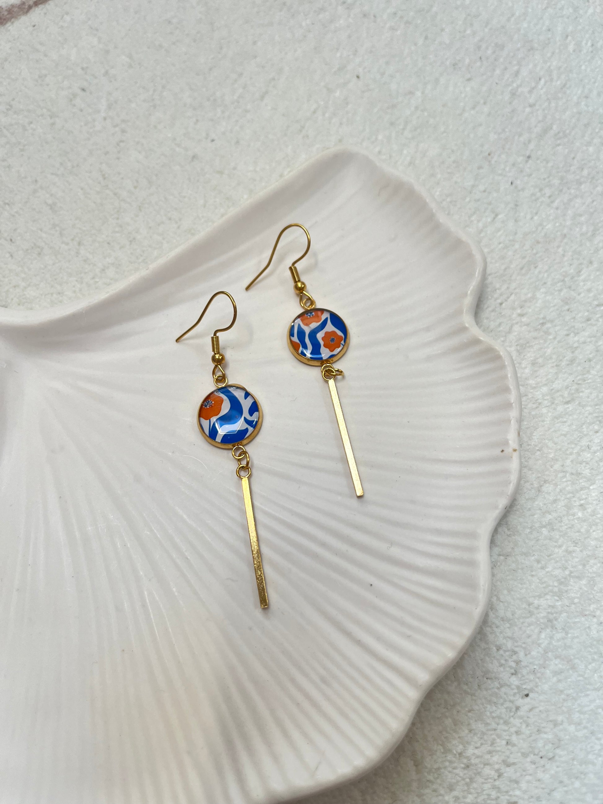 Boucle d’oreille pendante motif bleu orange